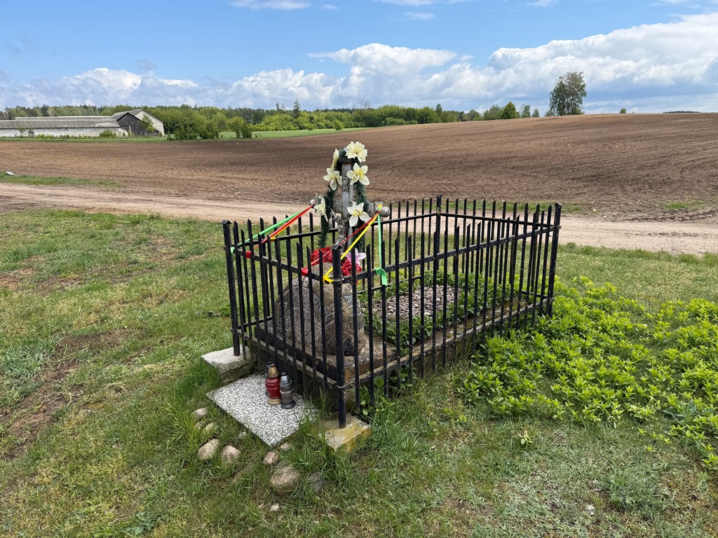 Pojechaliśmy tam w poszukiwani grobu. W trakcie tego rekonesansu okazało się, że w wiosce, na rozstaju dróg, stoi kamienny pomnik upamiętniający żołnierzy 3. Pułku Strzelców Konnych z Wołkowyska. Pomnik, a może grób polskich żołnierzy? Tego jeszcze wtedy nie wiedzieliśmy. Wiadomo już jednak było, że to właśnie w tym miejscu miejscowa ludność pochowała we wrześniu 1939 roku sześciu polskich żołnierzy – według napisu na pomniku – z 3. Pułku Strzelców Konnych z Wołkowyska, wśród nich Franciszka Cieśluka.