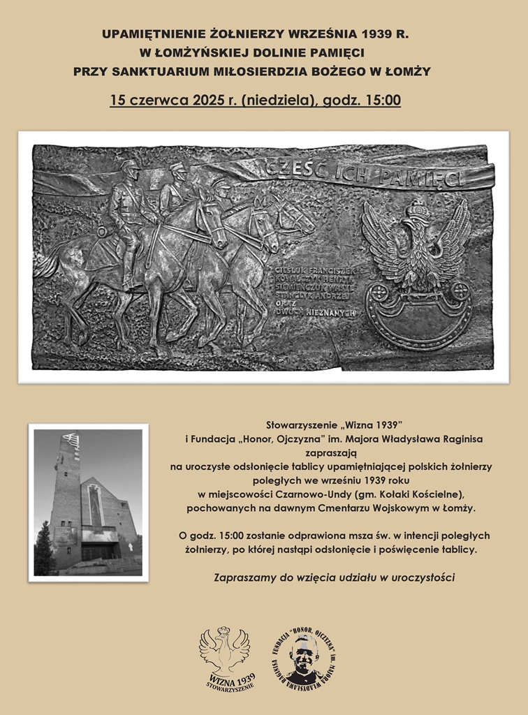 W najbliższą niedzielę, 15 czerwca, w Łomżyńskiej Dolinie Pamięci zostanie odsłonięta tablica upamiętniająca sześciu żołnierzy Wojska Polskiego poległych we wrześniu 1939 roku w miejscowości Czarnowo-Undy (gm. Kołaki Kościelne, pow. zambrowski), pochowanych na dawnym Cmentarzu Wojskowym w Łomży. Tożsamość czterech z nich została niedawno ustalona: to Franciszek Cieśluk z Czerwina, Henryk Kowalczyk z Suwałk, Andrzej Stanclyk z Żyrardowa, Wasyl Siemieńczuk z Augustowa (oraz dwóch żołnierzy nieznanych).